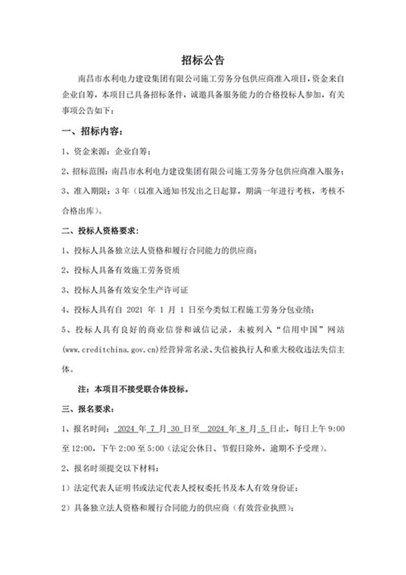 南昌市水利電力建設(shè)集團(tuán)有限公司施工勞務(wù)分包供應(yīng)商準(zhǔn)入項目