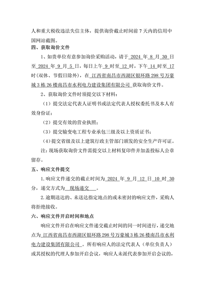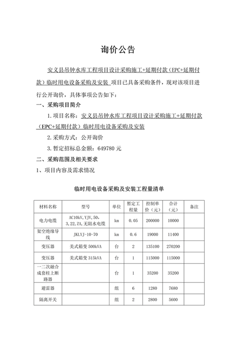 安義縣吊鐘水庫工程臨時用電采購及安裝項目詢價公告