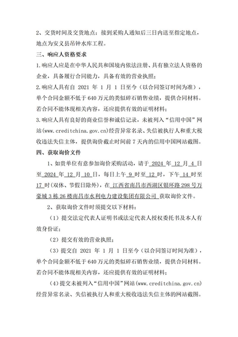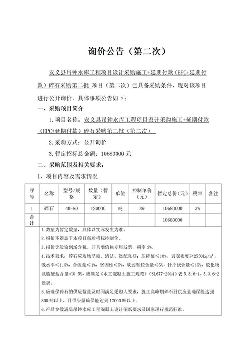 安義縣吊鐘水庫(kù)工程項(xiàng)目設(shè)計(jì)采購(gòu)施工+延期付款(EPC+延期付款)碎石采購(gòu)第二批項(xiàng)目(第二次)詢價(jià)公告