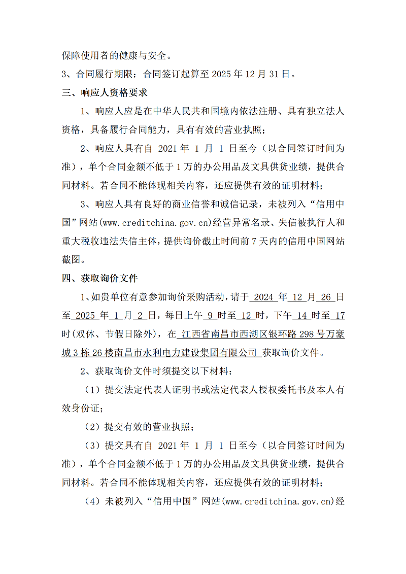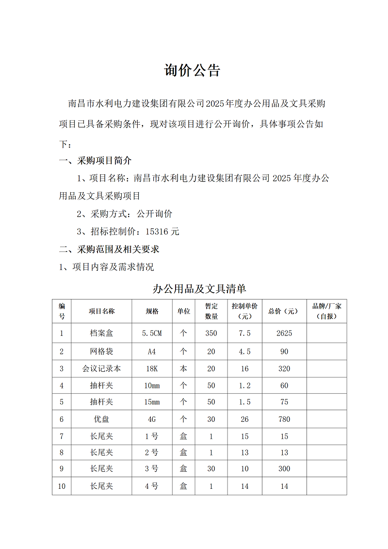 南昌市水利電力建設(shè)集團(tuán)有限公司2025年度辦公用品及文具采購(gòu)項(xiàng)目詢價(jià)公告