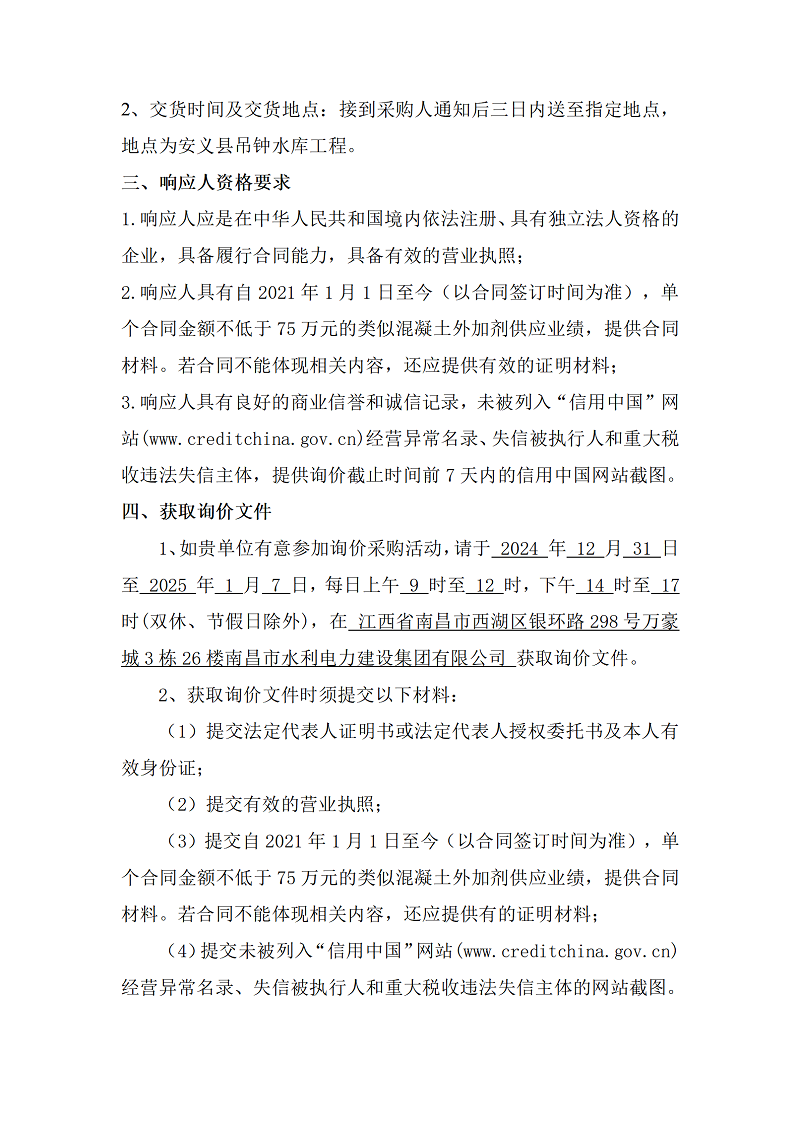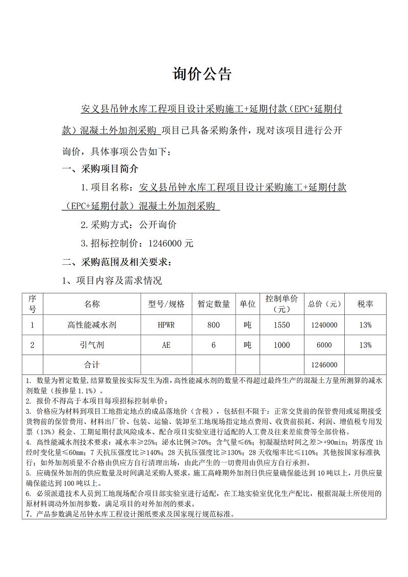 安義縣吊鐘水庫工程項目設計采購施工+延期付款(EPC+延期付款)混凝土外加劑采購項目詢價公告