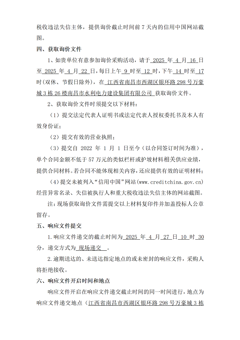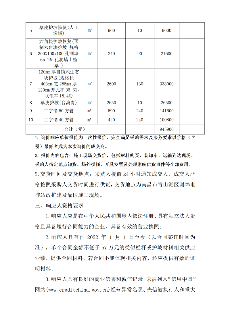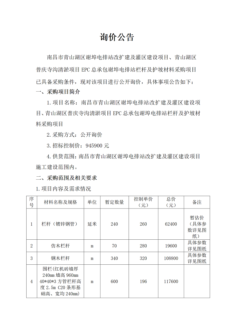 南昌市青山湖區(qū)謝埠電排站改擴建及灌區(qū)建設項目、青山湖區(qū)普慶寺溝清淤項目EPC總承包謝埠電排站欄桿及護坡材料采購項目詢價公告