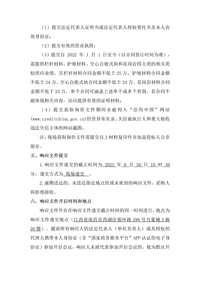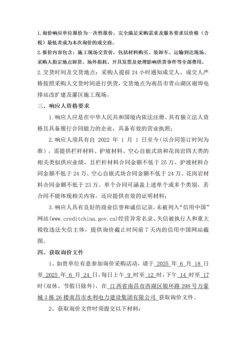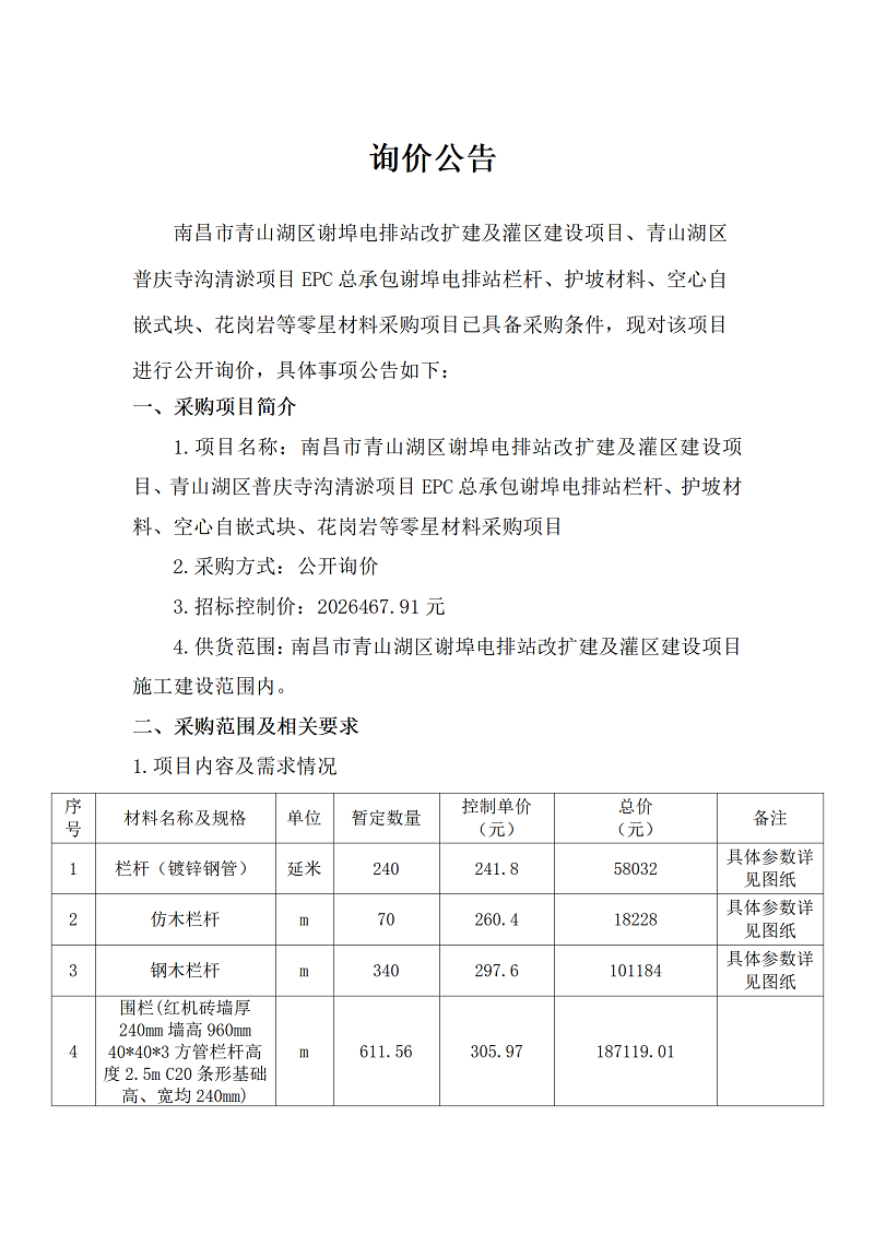 南昌市青山湖區(qū)謝埠電排站改擴建及灌區(qū)建設項目、青山湖區(qū)普慶寺溝清淤項目EPC總承包謝埠電排站欄桿、護坡材料、空心自嵌式塊、花崗巖等零星材料采購項目