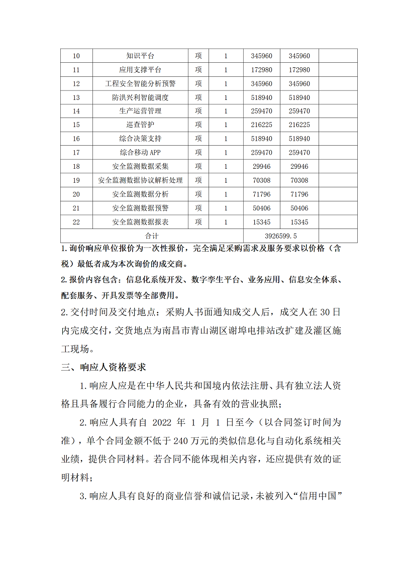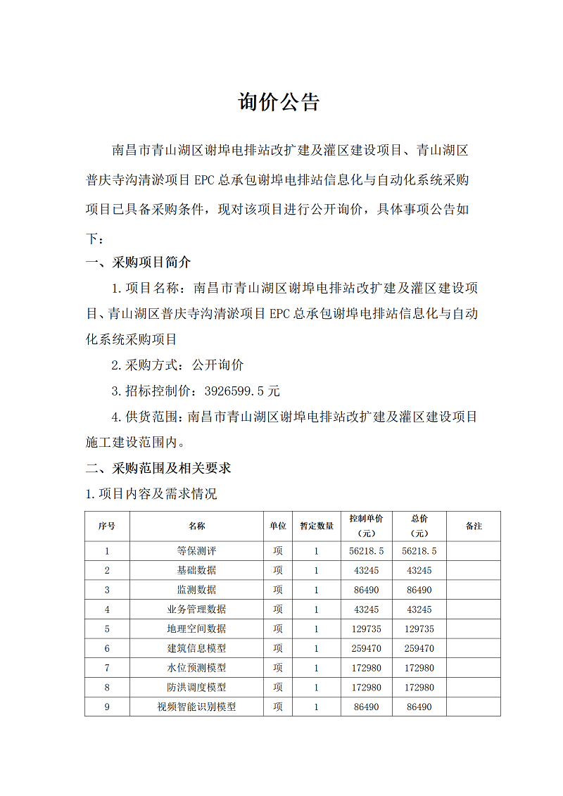 南昌市青山湖區(qū)謝埠電排站改擴建及灌區(qū)建設(shè)項目、青山湖區(qū)普慶寺溝清淤項目EPC總承包謝埠電排站信息化與自動化系統(tǒng)采購項目