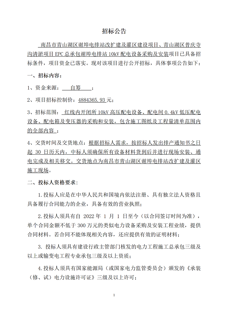 南昌市青山湖區(qū)謝埠電排站改擴(kuò)建及灌區(qū)建設(shè)項目、青山湖區(qū)普慶寺溝清淤項目EPC總承包謝埠電排站10kV配電設(shè)備采購及安裝項目招標(biāo)公告