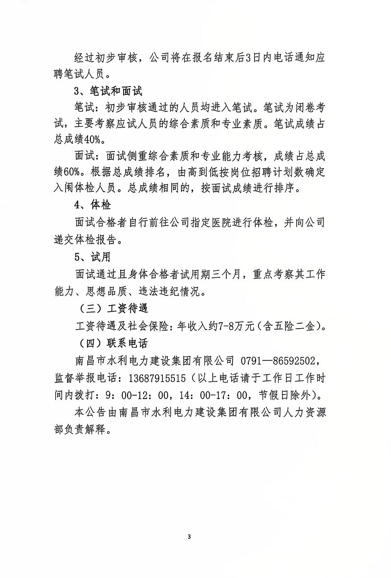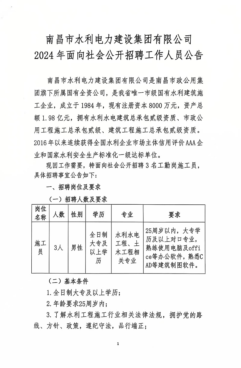 南昌市水利電力建設(shè)集團(tuán)有限公司2024年面向社會(huì)公開招聘工作人員公告
